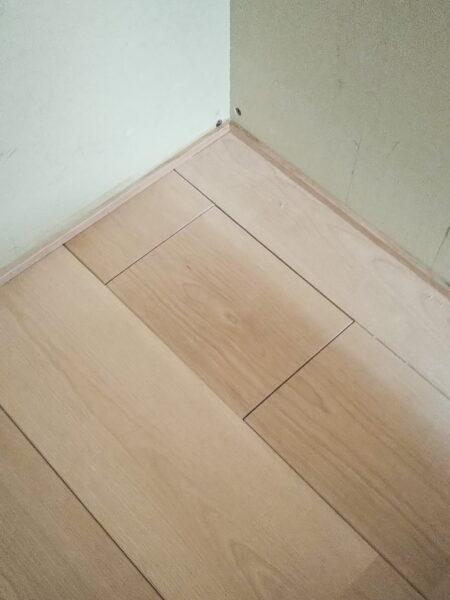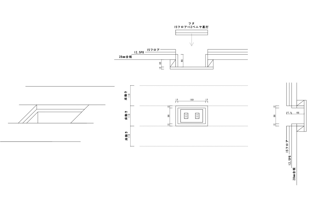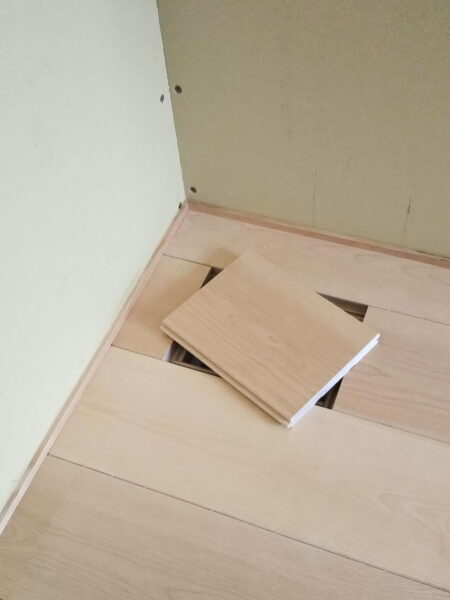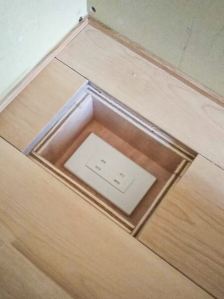 無垢材のフロアの一部を切り抜いて、コンセントを隠すための箱を製作。