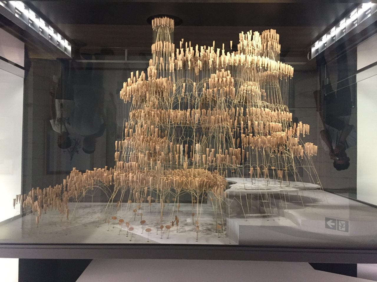 内部空間を構成する柱は、一本一本が樹木の形をしていて、森の中にいるような空間となっています。