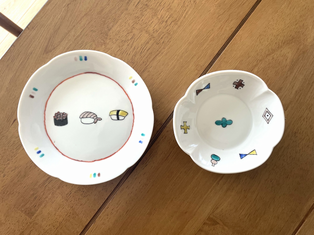 左は真っ白なお皿の状態から絵を描いてから色付けをして、