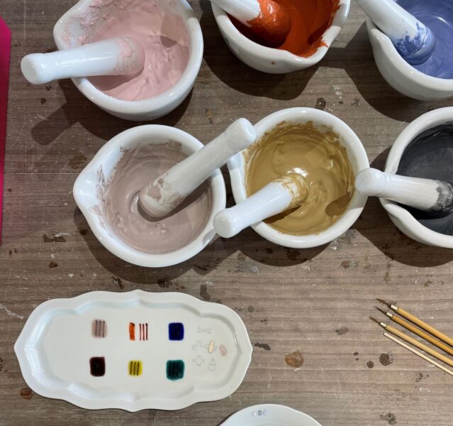 鮮やかな色合いが特徴の九谷焼ですが、絵付けする前の材料は少しくすんだ色合い。