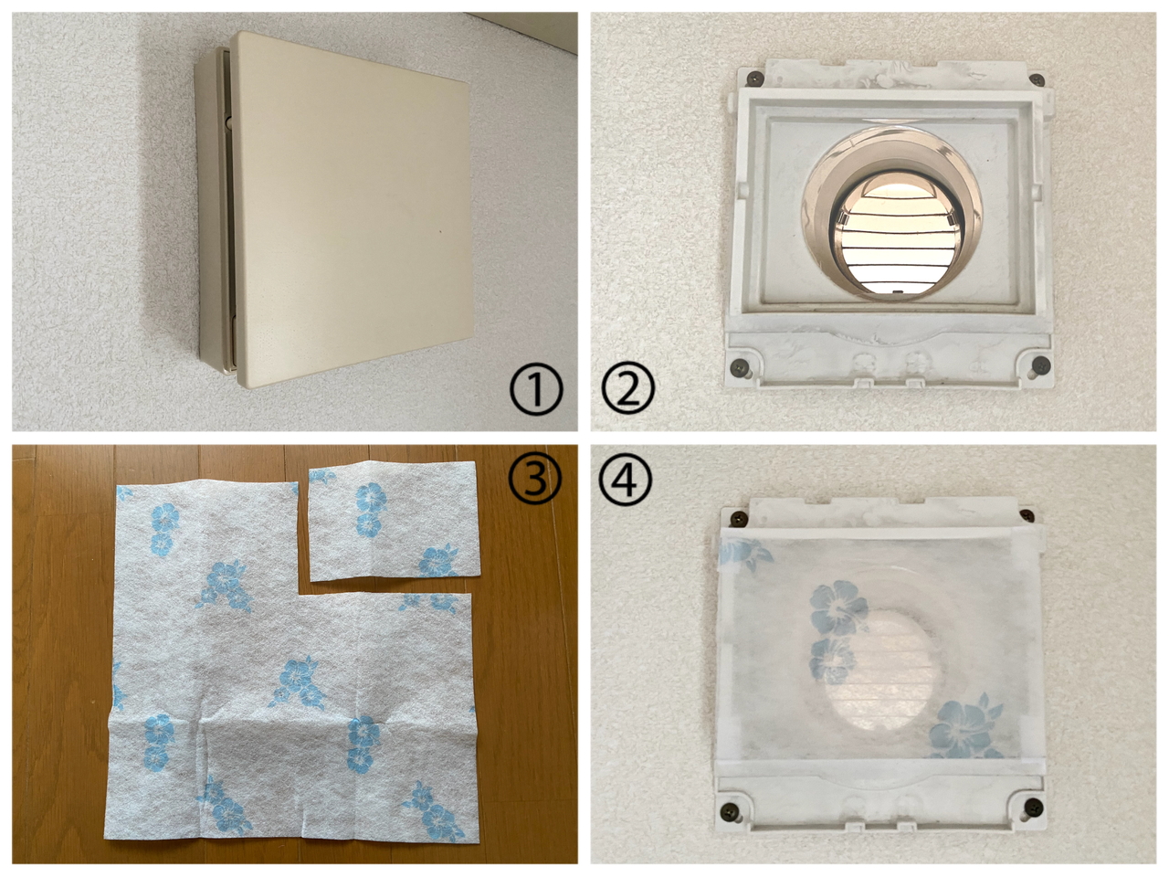 換気扇のフタを取り、フィルターを付ける範囲を確認します。②