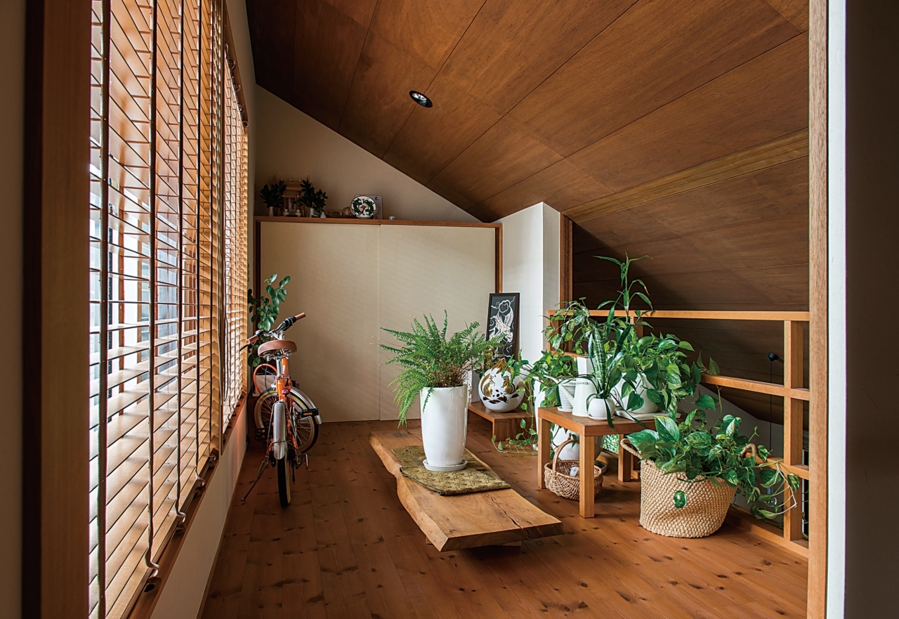 2階には高さを抑えた斜め天井の洋室と小屋裏収納への扉が。ゲストルームとしても活用