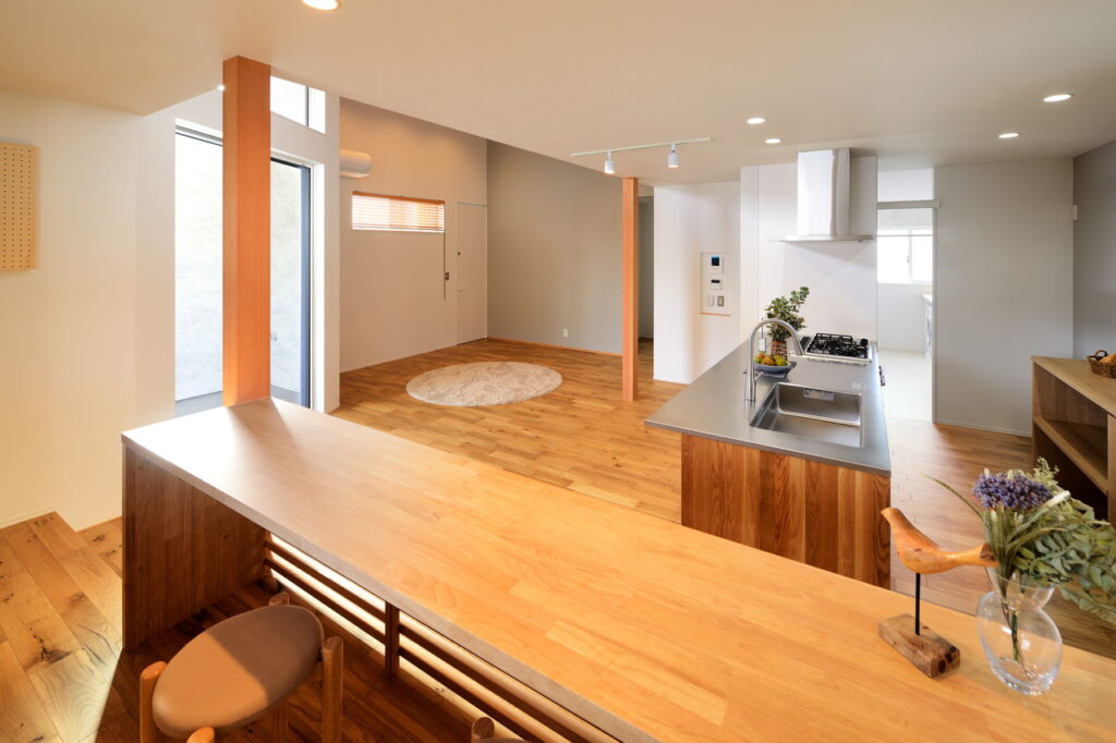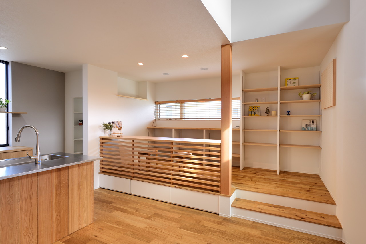 2段上がっていることにより、カウンターの椅子に座ったときにキッチンにいる人と目線が同じ高さになり、家族と心地よく交流できるようになっています。