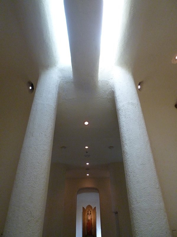 シルクロードをイメージした回廊。石のような壁に寄りかかる梁!柱を受ける岩!