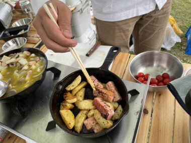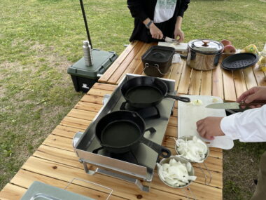 テーブルを繋げてコンロや調理器具をまとめてキッチンを配置。