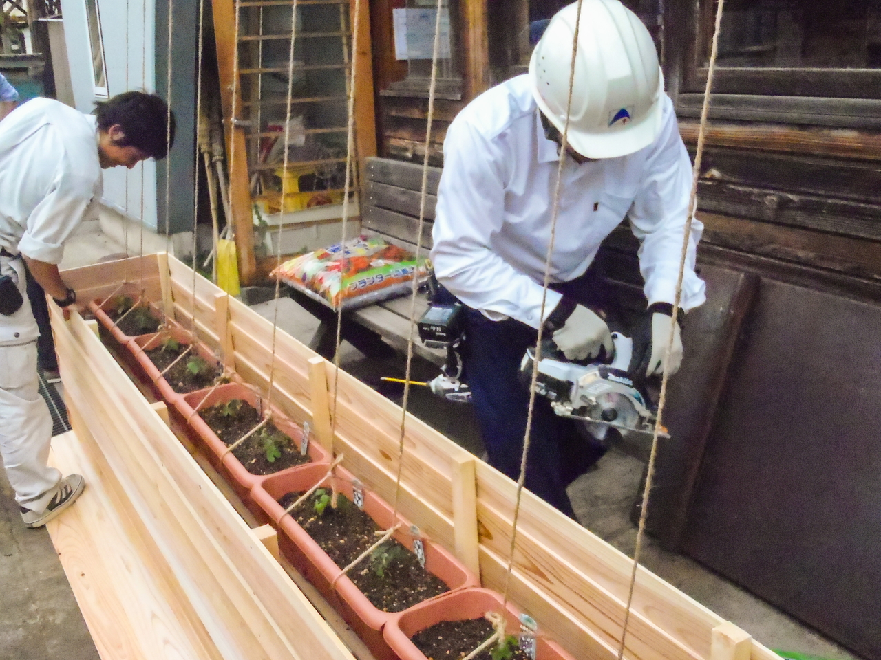 2023年の現在は工場休憩所の南側一面のみですが、朝顔の葉が青々として上に伸びるため準備中です。