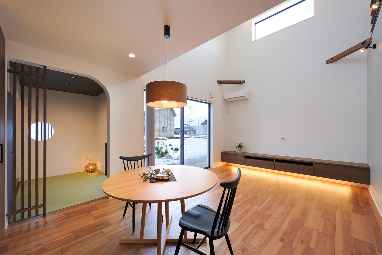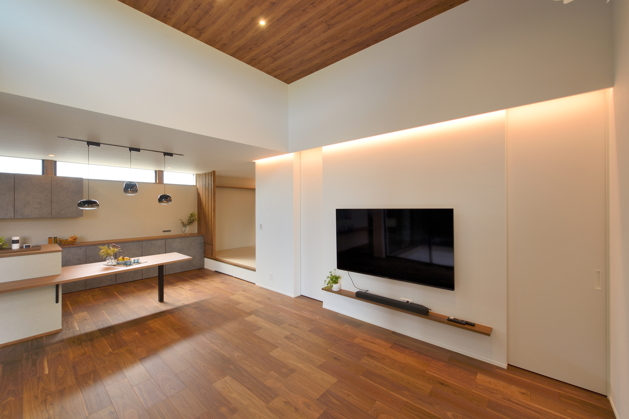 置型テレビ同様にテレビ台兼リビング収納や、床から浮かせて間接照明を入れたり、棚板でオープンにすることもできます。