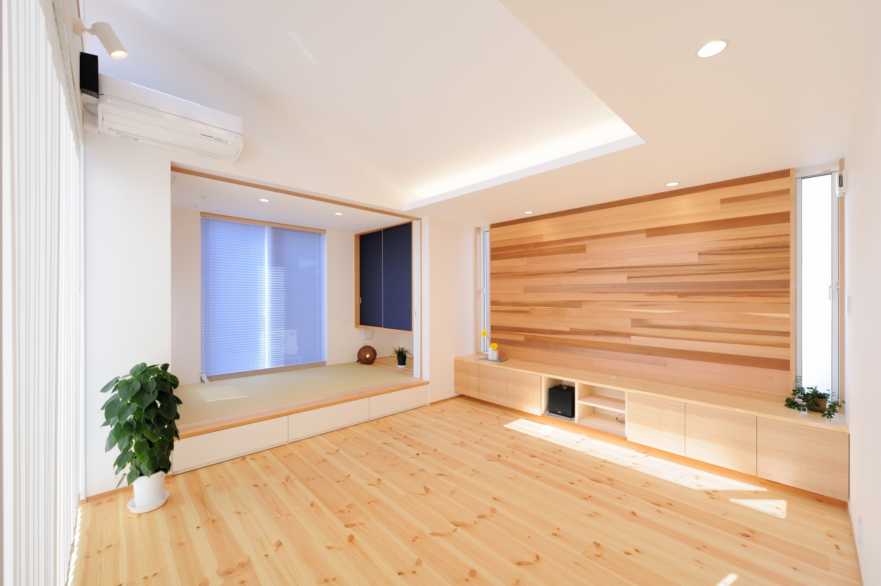 テレビ周りをアクセントクロスやタイル、木張りでリビングの雰囲気も良くなります。