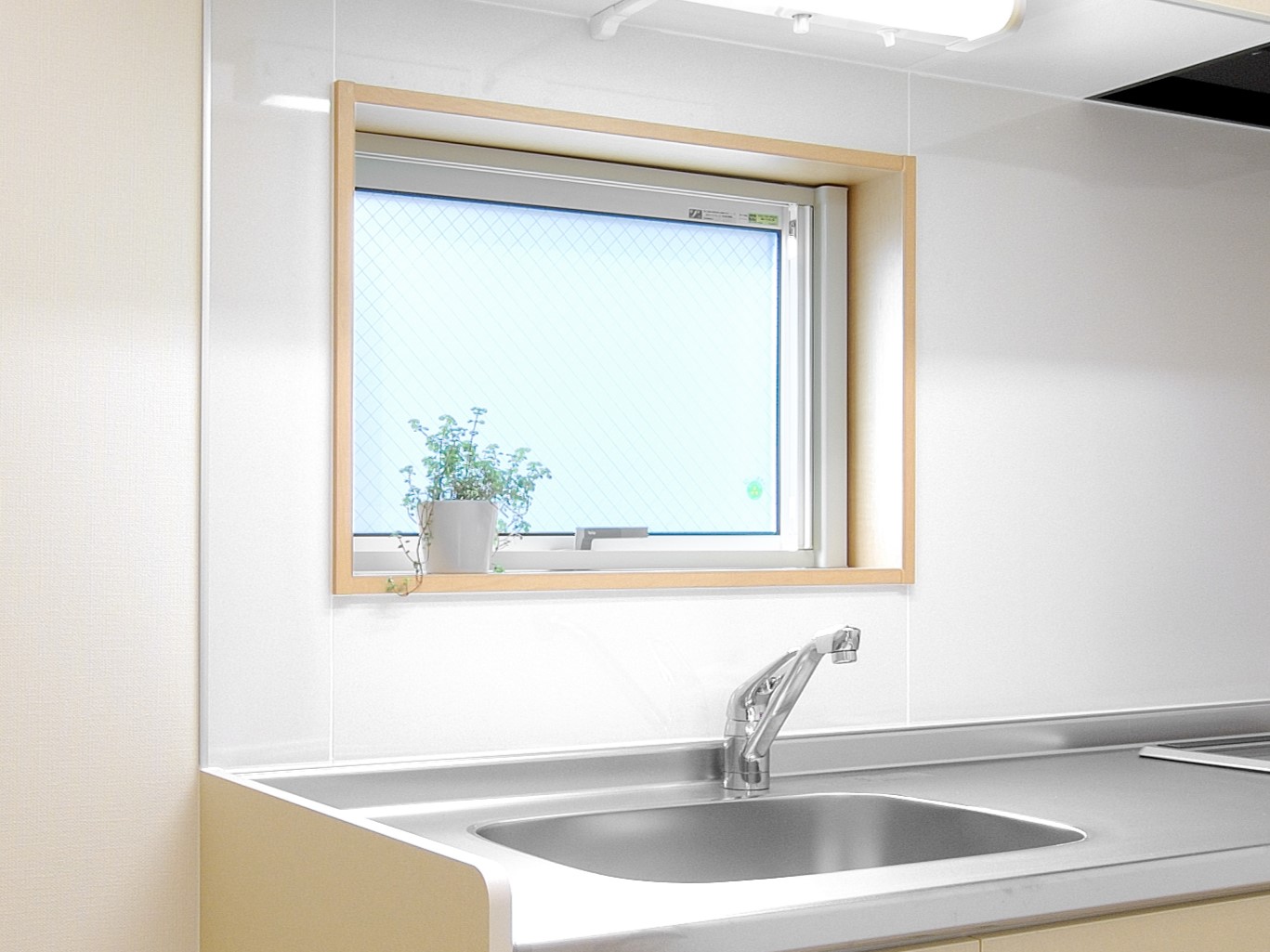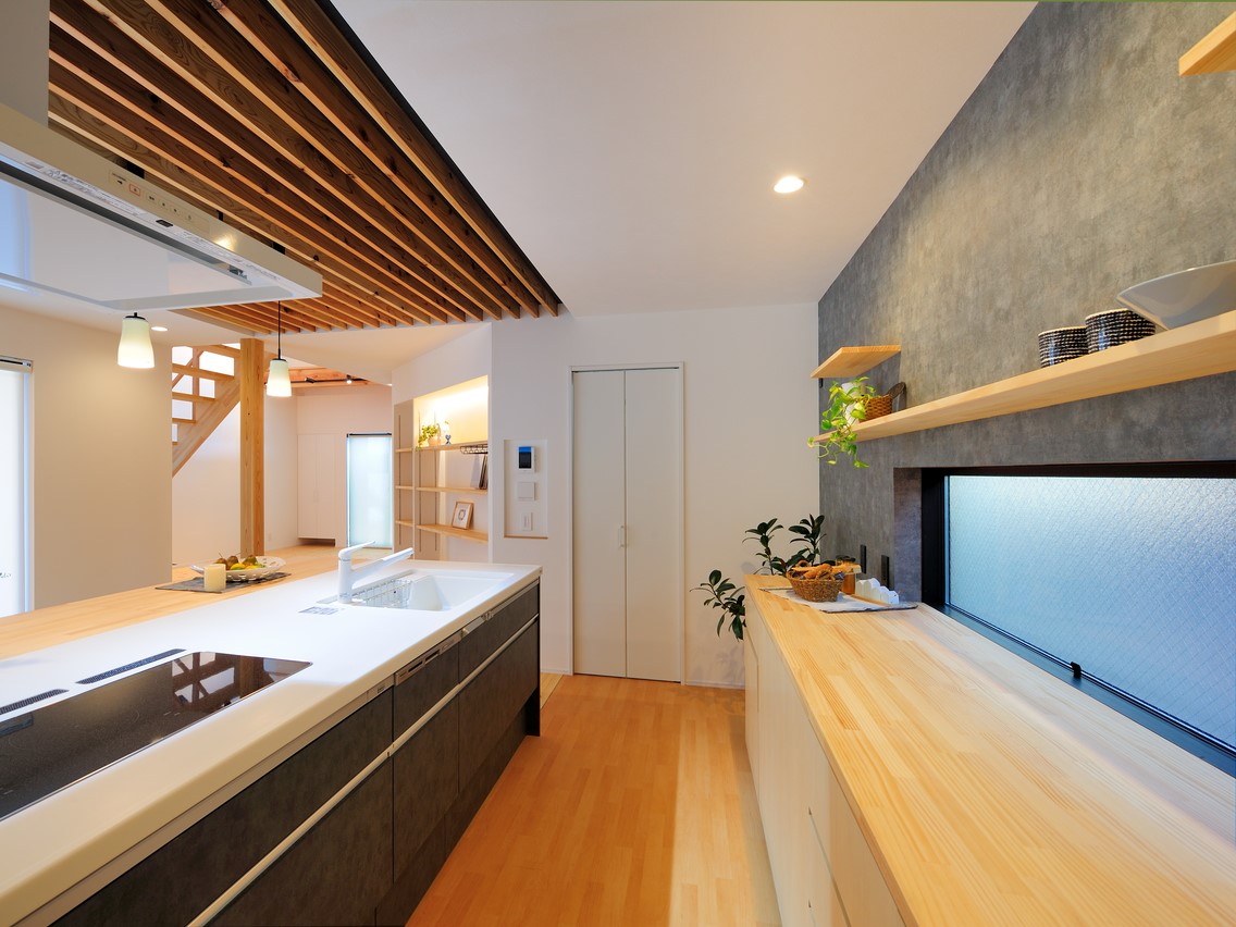 窓枠の代わりにカウンターを延長して取り付けることで作業スペースを明るく開放的な空間にしています。
