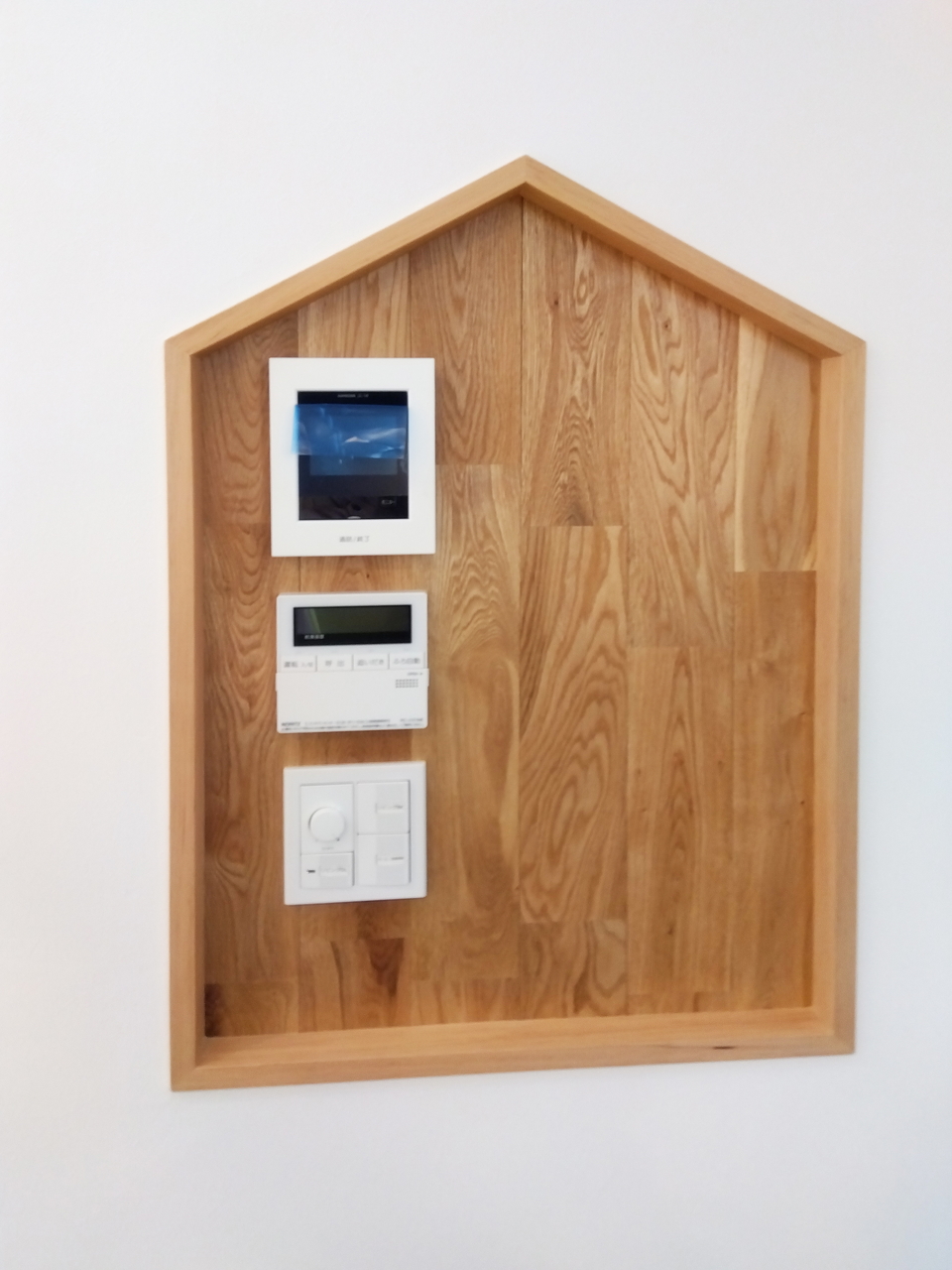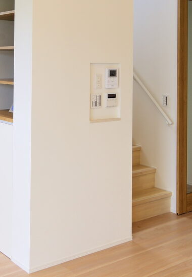 給湯リモコンやインターホンなどをニッチ内にまとめて設置することでリモコン類が壁から飛び出ずにスッキリ納まります。