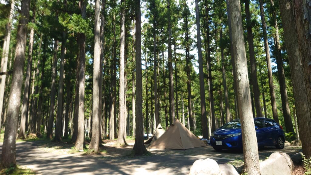 今回のキャンプ場は、杉林の立木がとてもきれいなキャンプ場でした。