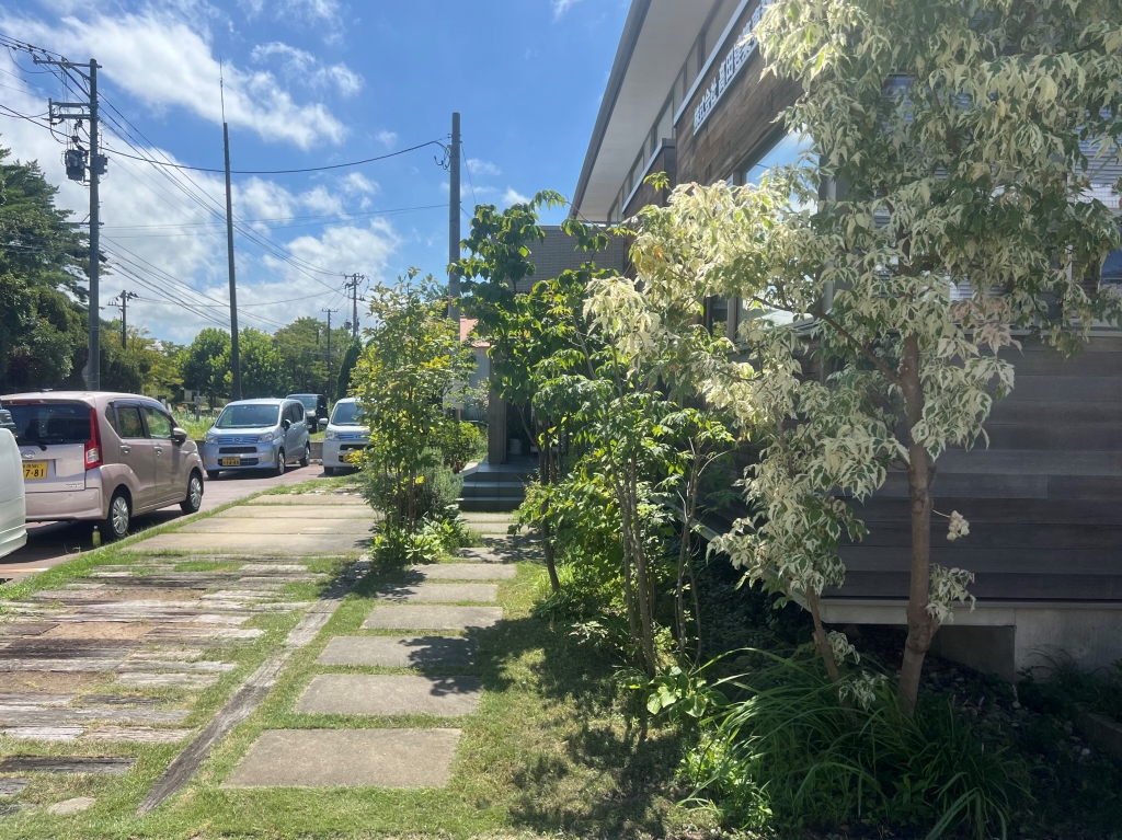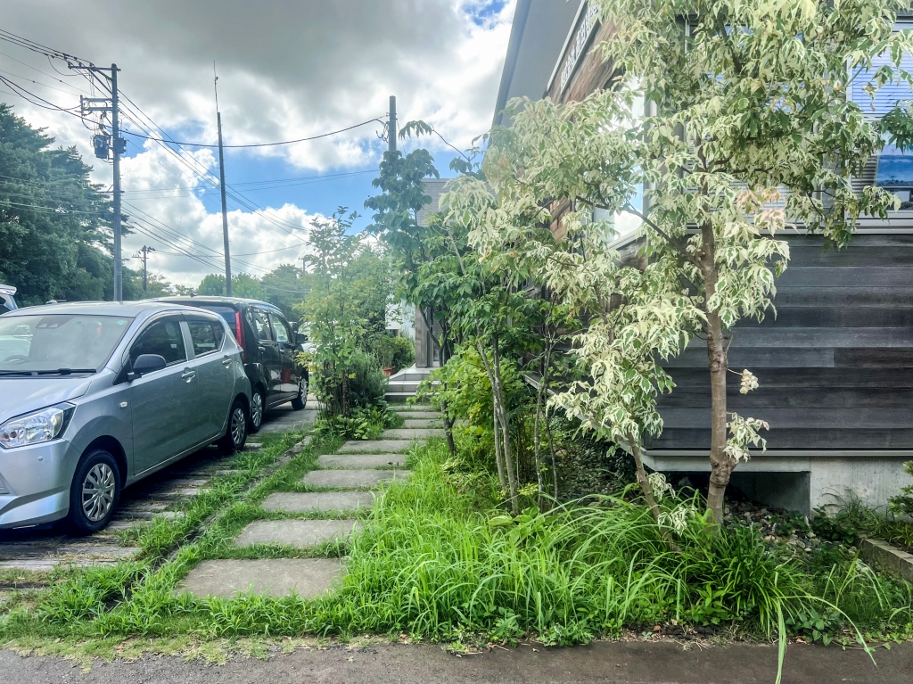 お盆に入る前に営業所の庭を手入れしたのですが、一か月も経たないうちにモシャモシャに。今回は、このアプローチ空間をさっぱりさせたいと思います!