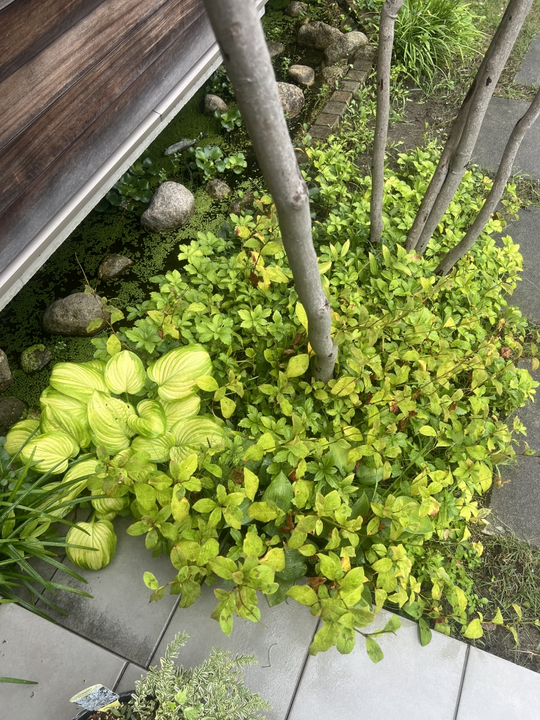 常緑性で、常に元気な緑色でいてくれます。当社では、フッキソウの中にギボウシを混ぜて植えています。グランドカバーは数種類混ぜて使うのがポイントだと思います!