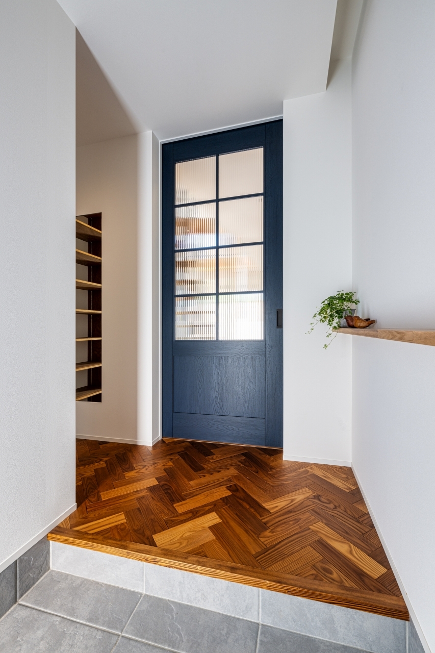住まいづくりを始める前は、リビングドアは”アクセントになるカラーにしたい”と思っていたのですが、間取りが決まり→床の色が決まり→と打合せが進んでいくと、