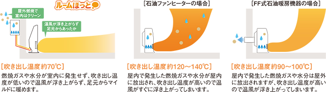 こちらは、給湯器で温めた温水(不凍液)から、熱を取り出し、温風として室内を暖める暖房設備になります。温風は足元へむけて吹き出す為、足元から室内を暖めてくれます。室温も上げやすく、単体でも充分に暖房効果があります。また、ガスファンヒーターと違い、燃焼が屋外で行われるため、定期的な換気も必要ありません。