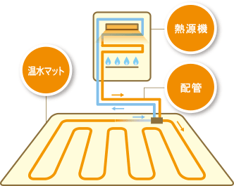 床暖房は、床(フローリング)の下に、温水を循環させ、床から暖める暖房設備になります。主に、給湯器で暖めた温水(不凍液)を循環させています。