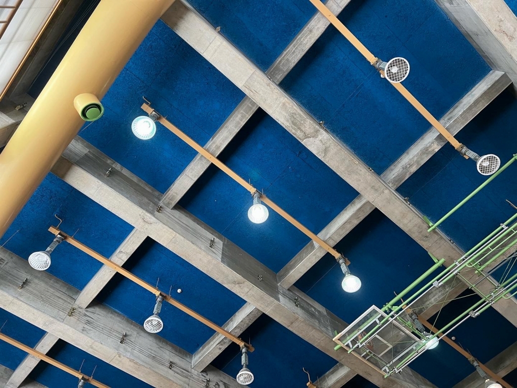 体育館の天井には青が使われています。力強い構造体や設備と、鮮やかなブルーが共存しています。難しそうな色をあっさりと共存させていて、とても勉強になります。