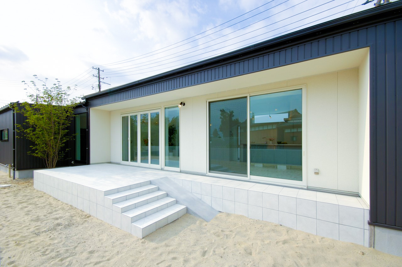 愛犬家ご夫婦が選んだのはワンちゃんが滑りにくいタイルのテラス。(ちなみに室内もタイルです)スロープを設け、上り下りもラクラク。