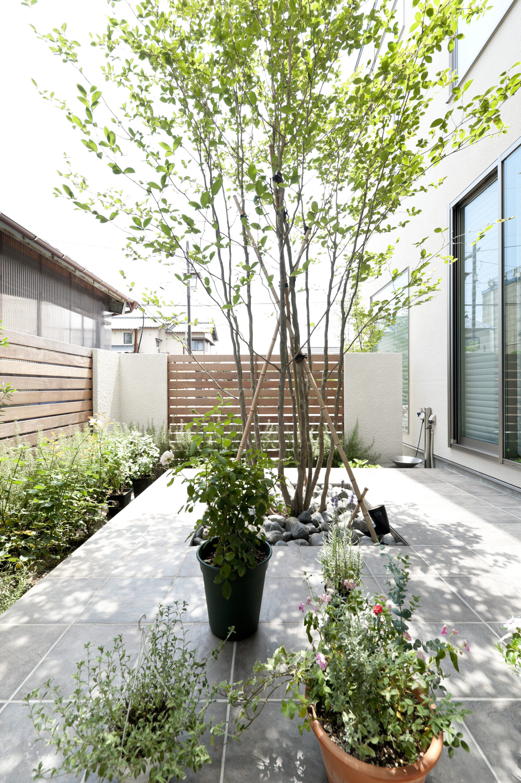 大きなシンボルツリーを中心に、バラなどのお花で彩られたタイルのテラス。