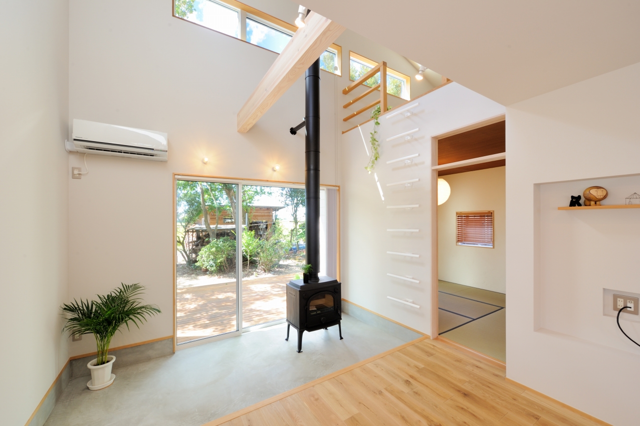 リビングに薪ストーブの置かれた土間があり、すでに1段下がった状態でデッキと繋がるため、庭との高低差も少なくなり、小さなお子さんがいても安心です。