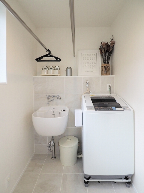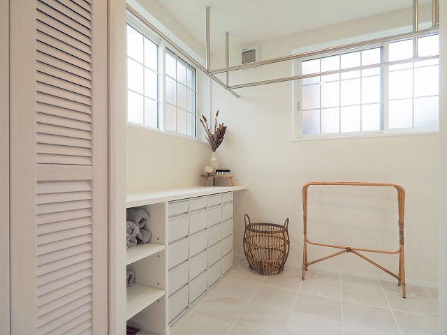 広々としたランドリールームには、収納ボックスがぴったり納まり、洗濯機とスロップシンクの位置も使い勝手抜群です。