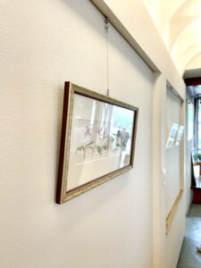 長岡本社の玄関にもピクチャーレールが埋め込まれ、たくさんの絵画やパネルが展示されています。