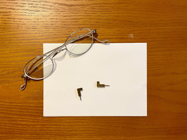 一見、眼鏡が壁に張り付いているように見えるのですが、外すとこの様になっていて、L字型の画鋲に折りたたんだ眼鏡をかけることができます。