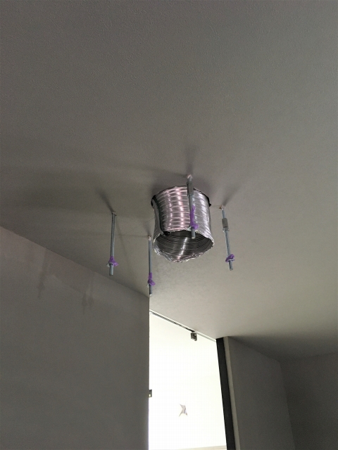 予め天井裏に仕込んであったダクトと吊ボルトを天井から下ろし、レンジフードと位置を合わせます。