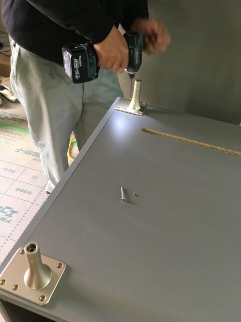 トーヨーキッチン独自の脚「エアフロー」をキャビネットに取付けます。