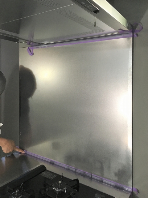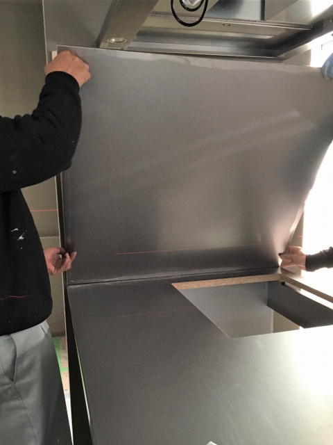 キッチン天板のステンレスカウンターを載せ、壁にステンレスのパネルを貼ります。