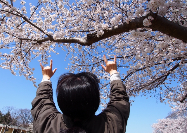 満開の桜の木の下で元気にレッツスマイル・フォーユー(当社の合言葉)!