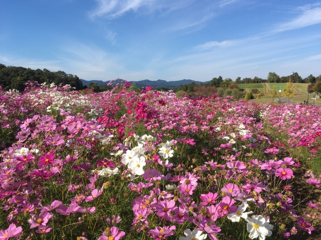 有名どころではありますが、近くに住みながらも今までイルミネーションの季節しか訪れる機会がなく、初めて秋に訪れました。様々な品種・色のコスモスとバラが青空にとても映えて、写真を撮る手が止まりませんでした。