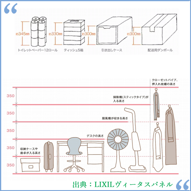 こちらのように家にあるほとんどのものが、高さ350㎜で納まるという法則です。
