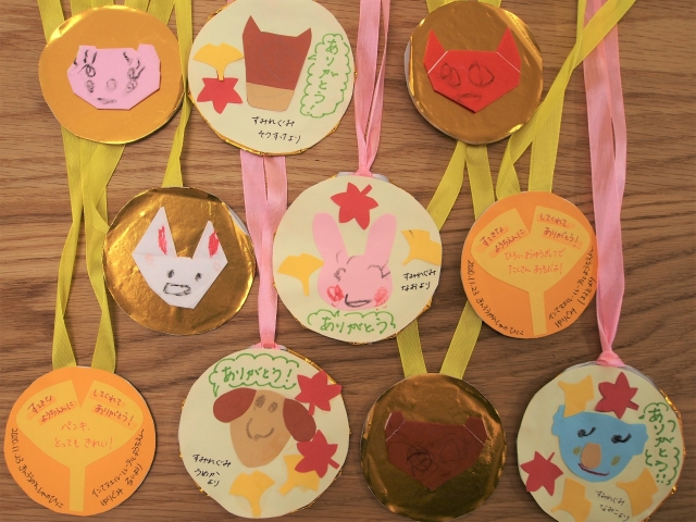 なんと、ひとりひとり前に出てきて、自分で作った金メダルを、私たちの首にかけてくれました。