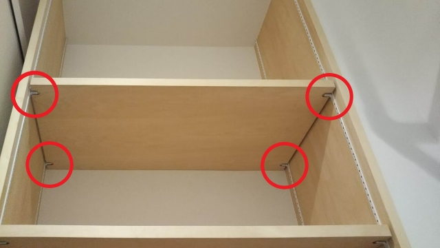 物を出し入れする際、棚板が滑り落ちないようにするための工夫です。