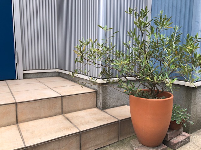 玄関にはオリーブの鉢があります。