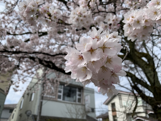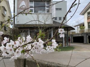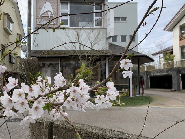 朝、長岡本社に出社すると、会社の目の前の桜が満開で、