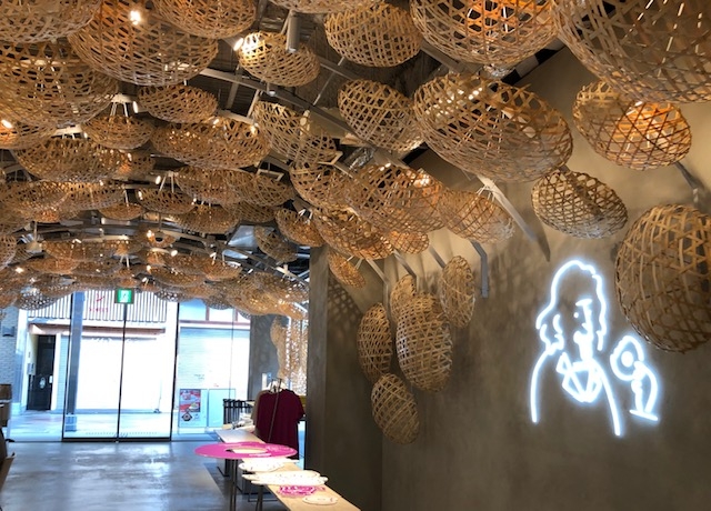京都で伝統的な竹かごを天井にドーム型に取り付けて、空間に立体感と楽しさを与えていました。