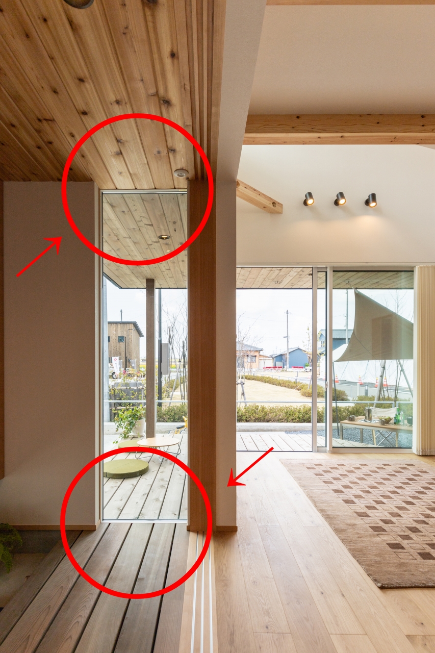 ②天井の板張りを室内と外と揃える