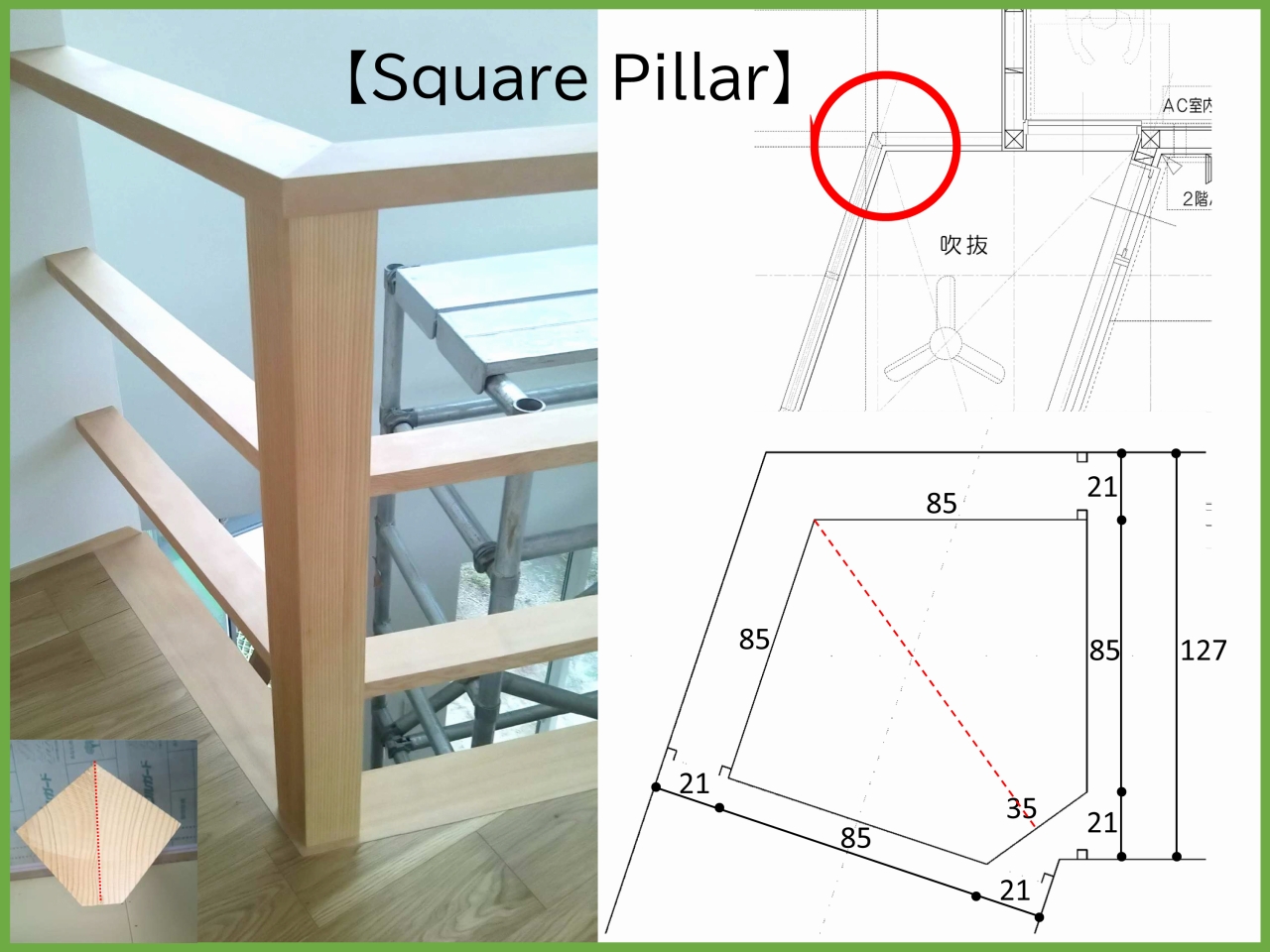 ひし形の吹抜けに合わせて作成した、5角形の柱。