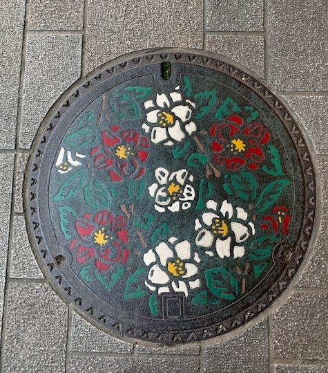 市の花であるユキツバキがメインのマンホールです。
