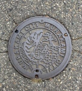 中央ではねる鮭が印象的なこちらは、村上市のマンホールです。