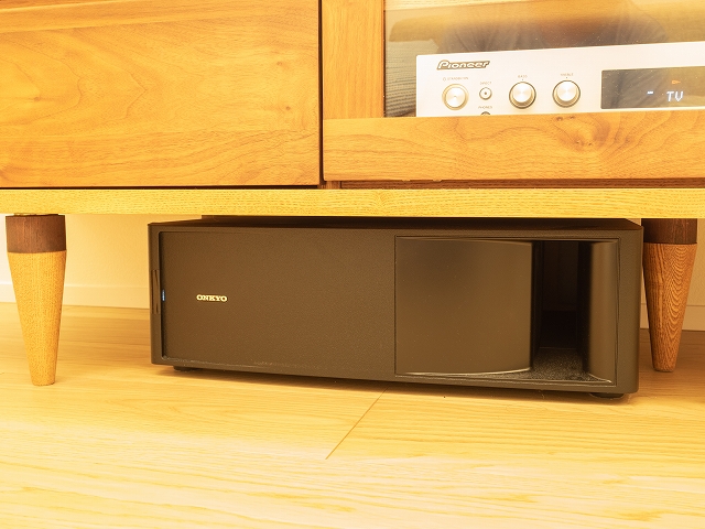 切れの良い中高音を奏でるスピーカーですが、小型なのでどうしても低域が弱くなります。その対策として、愛用してきたTVボードの足を家具職人さんに少し長くしてもらい、その下に低音用スピーカーを隠すように設置しました。