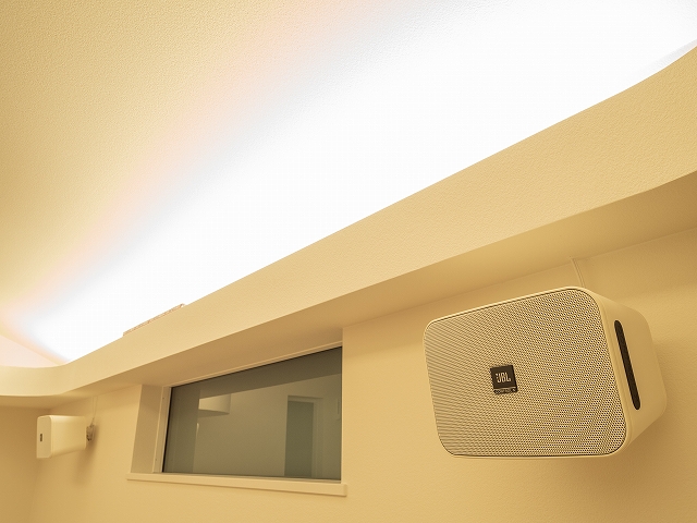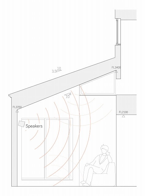 適度な残響は、音空間を豊かにしてくれます。上方向に昇っていく天井は、スピーカーとセットとなるもう一つの音響装置になってくれました。小さなスピーカーからは想像できないような音の広がり方で、リビングが小さなライブスペースの様に感じられます。