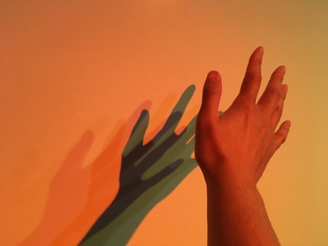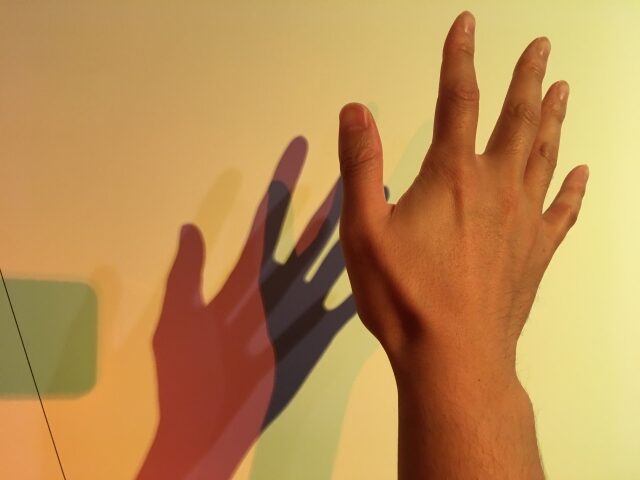 黄色の光の影は紫色になり、赤色の光の影は青色に映し出されます。