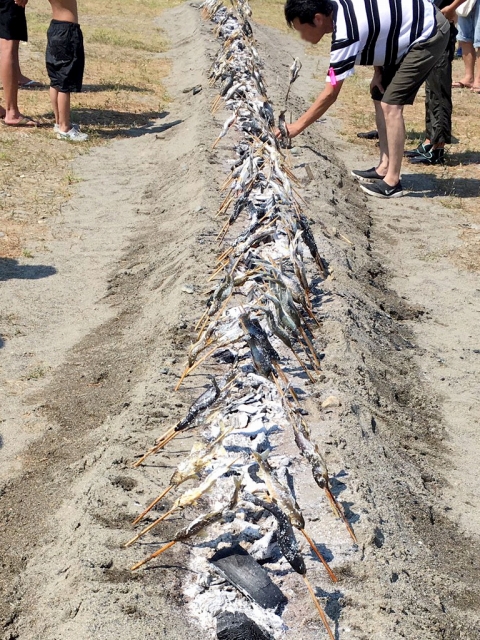調理は串を刺した魚を、一直線にならぶ炭火の脇にセットしていきます。