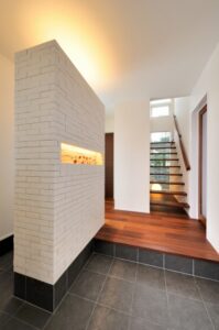 エントランスとシューズクロークの間仕切り壁にレンガを表現した印象的なデザインを採用。