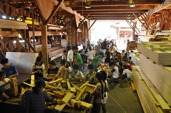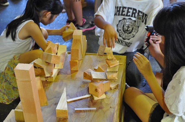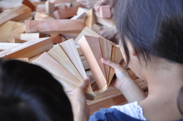 山積みになった端材を前に、子供たちは目を輝かせながら、