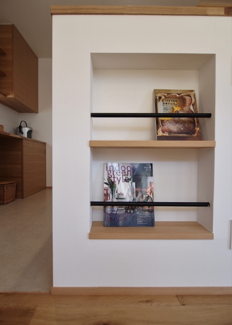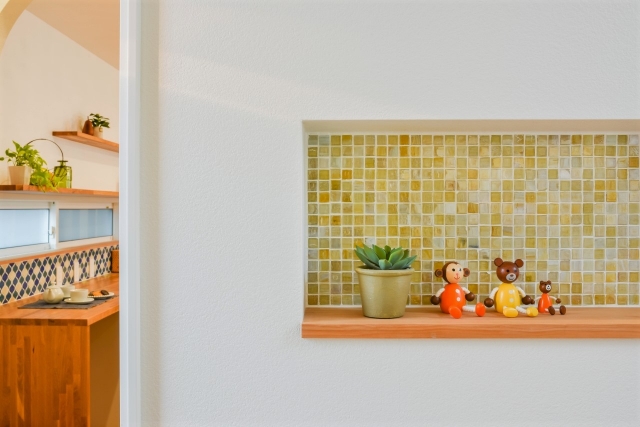 壁の奥行を利用したニッチ。タイルや板張りなど素材によって華やかな印象に。
