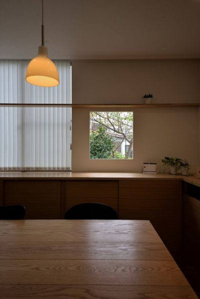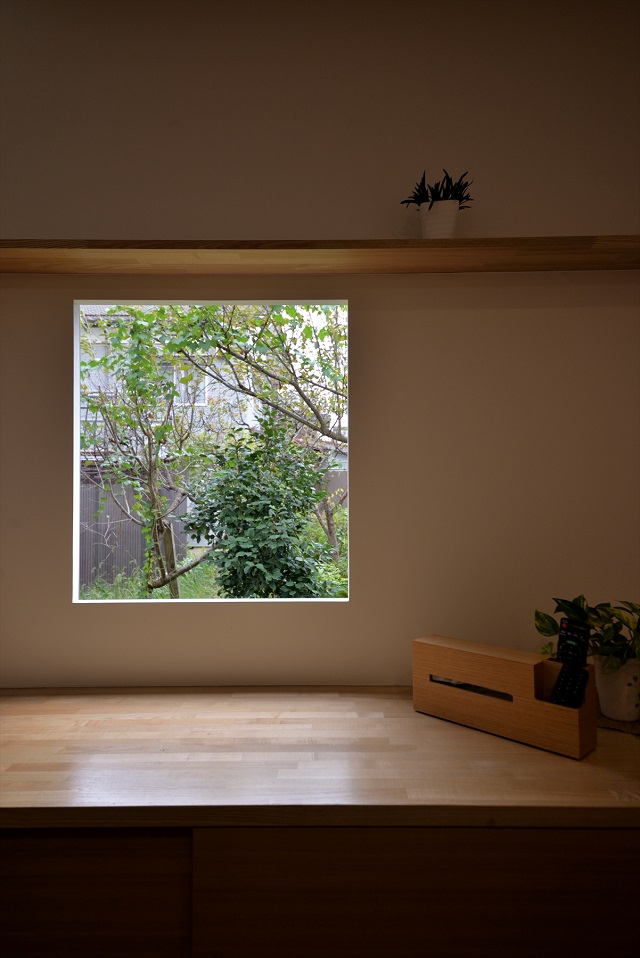 明るさを抑えた部屋の中から外の植栽に視線が向かう。